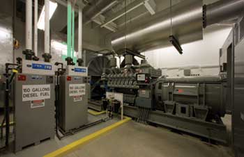 To eliminate the potential for power failures, the completed facility features rotary-based uninterrupted power supply (UPS) — a flywheel-like system that continues turning until emergency generators — some 16 in all — come on line. The 2.25 megawatt generators not only support critical loads for computer equipment, but essential loads for life-safety and mechanical equipment.
