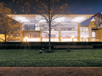 The common denominator was a lack of space for mechanical, electrical and plumbing systems, a condition resulting from the transparency of the design, according to McLean. "We didn't have many furred out walls, so we had to spend quite a bit of time coordinating with the mechanical and plumbing contractors," he says. "We employed the floor slabs to the extent possible and then began to look for mechanical corridors and similar avenues to accommodate the remaining conduits." Unique systems and applications were the order of the day. In addition providing a bold signature, the flying carpet functions as a sunscreen, complete with computermodeled wings to ensure underlying skylights deliver appropriate amounts of lighting to assorted galleries. The screen allows the color of light to shine through but not the heat loads typically associated with glass. In addition, the screen incorporates programmable electrical blinds, as well as a base-board heating system on the third floor to keep the glass overhead from condensing.