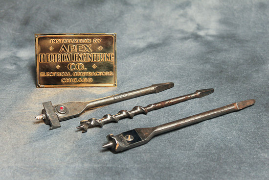 Description: Brace drill bits. Brass equipment plaque of installation by Apex Electrical Engineering Company, Electrical Contractors of Chicago