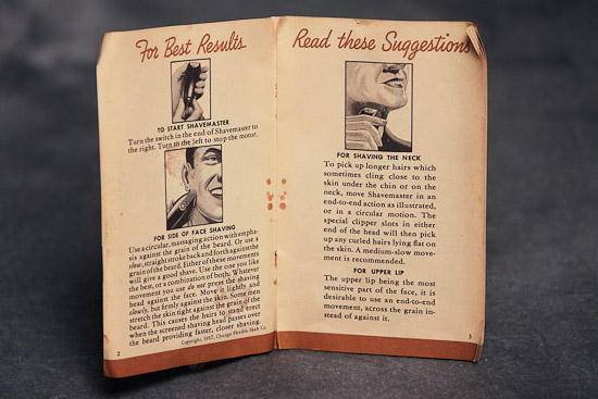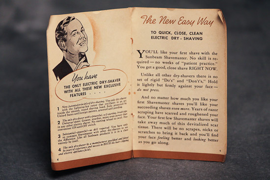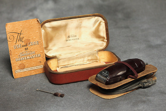 Description: Electric Razor made by Sunbeam, donated by: Timothy Fitzgibbons. Instructional manual, cleaning brush and case.