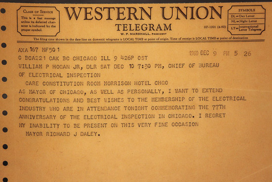 Ammeters, Lamp Post Fixture, 800 Amp Fuse and Western Union Telegram from Major Richard J. Daley.