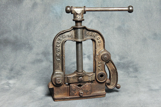 Description: Greenfield No. 2 conduit piping vise, manufactured in Greenfield, Mass