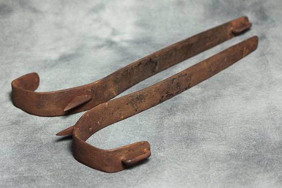 Description: Electrical lineman’s gafs for telephone pole climbing.